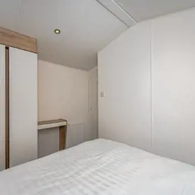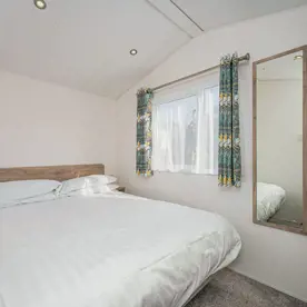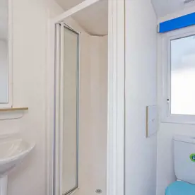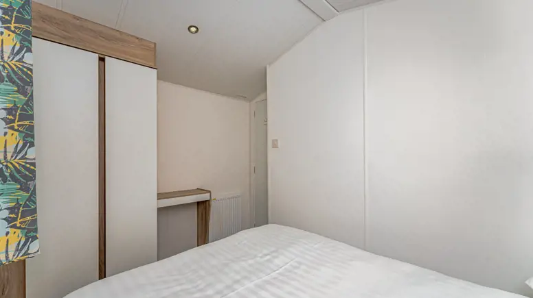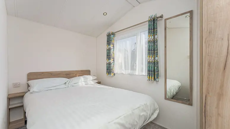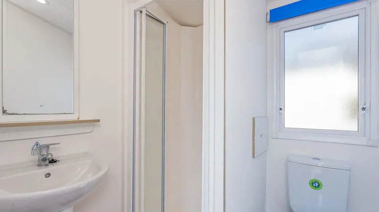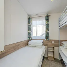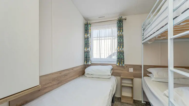 The master bedroom features a double bed, and the twin bedroom has a single bed and bunkbed. There’s a family shower room, sink and WC.