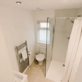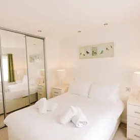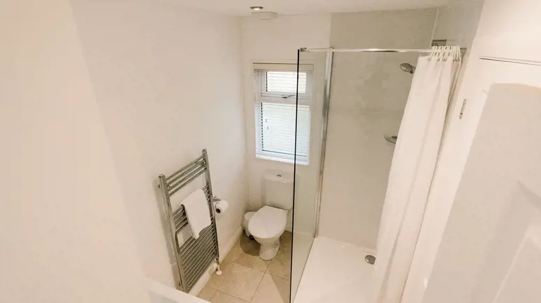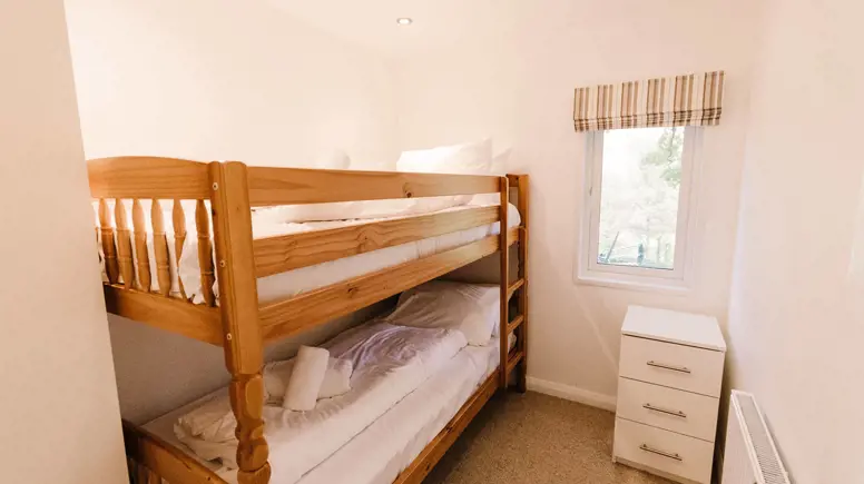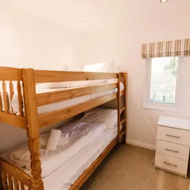 The master bedroom features a king side bed, and a separate door to the main shower room. The second bedroom features bunk beds.