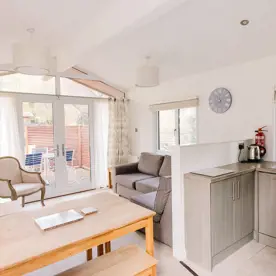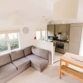 The open plan living area features a Smart TV with surround sound and fully equipped kitchen. It opens out onto the decking area where you’ll find a bistro set, perfect for alfresco dining or relaxing.
