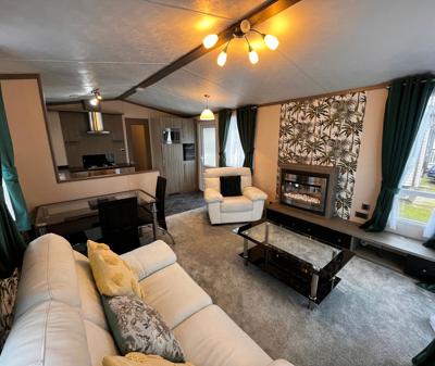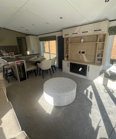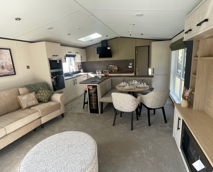 Experience refined holiday living with the Carnaby Grantley Lodge—a luxurious unit designed for comfort and style. This 42' x 14' lodge features panoramic patio doors, a unique dining island with cocktail bar and wine cooler, and a sleek walkthrough kitchen with integrated appliances.