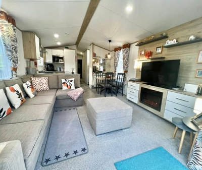 This bright and spacious extra large home at 40 foot long has beautiful French doors at the front, opening into the living area featuring a large L-shaped couch with an armrest and handy USB socket. Dine with the family at the free-standing dining table before getting a good night's rest in the comfortable bedrooms, just a short walk from Coldingham Bay beach.